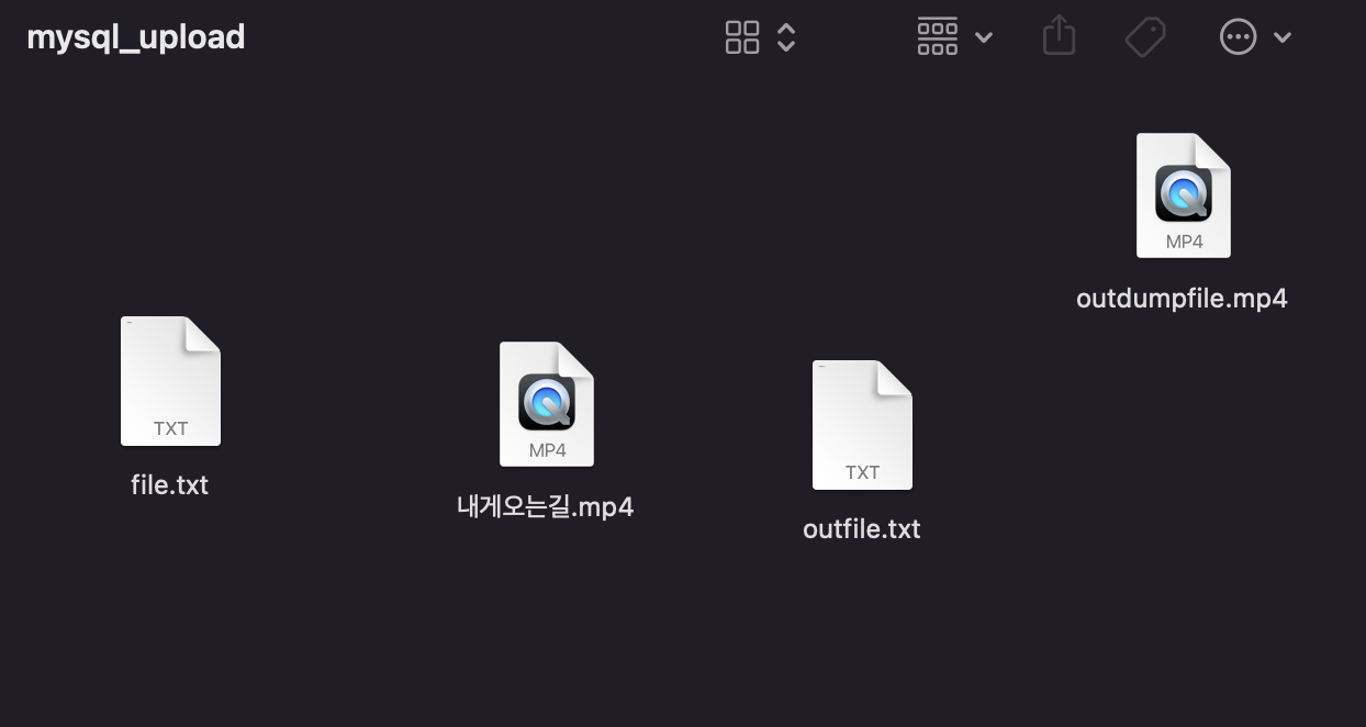 INSERT INTO movietbl values(2, "TEST_MOVIE", LOAD_FILE('/Users/wonil/study/mysql_upload/file.txt'), LOAD_FILE('/Users/wonil/study/mysql_upload/내게오는길.mp4'));