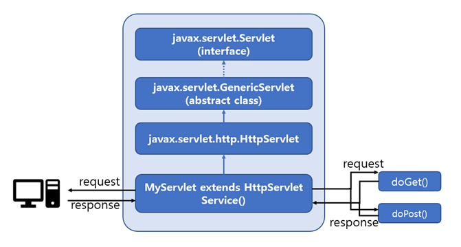 HttpServletRequest, HttpServletResponse 두 클래스는 Java Servlet API 에서 사용되는 클래스로, HTTP 요청과 응답을 처리하는데 사용된다. 여기서 Servlet 이란 클라이언트의 요청을 처리하고 결과를 응답해주는 자바 웹 프로그래밍 기술을 말한다.