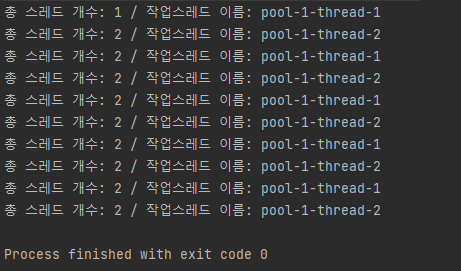 위 결과를 보면 계속 Runnable 구현클래스가 run() 메서드 내에서 예외를 발생시키지만, thread-1, 2 를 삭제시키지 않고 계속 재사용하는 것을 확인할 수 있다. ( submit() 메서드의 특징 )