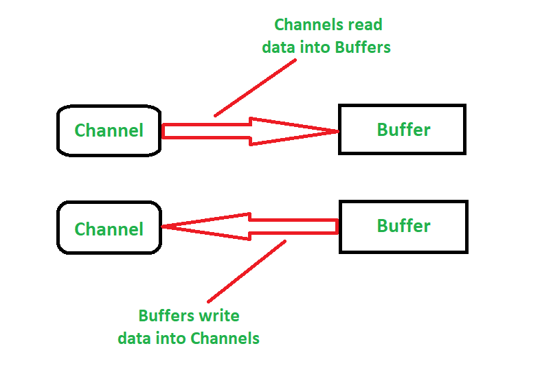 2. Channel: 채널은 새로운 기본 IO abstraction 이다. 채널은 스트림과 유사하다고 볼 수 있는데, 채널은 스트림과 다르게 데이터를 읽을 수도 쓸 수도 있다. 서로 다른 엔티티에 대한 연결은 Non-Blocking 방식의 IO 동작을 수행할 수 있는 다양한 채널로 표시된다. 채널은 매체 또는 게이트웨이의 역할을 한다.