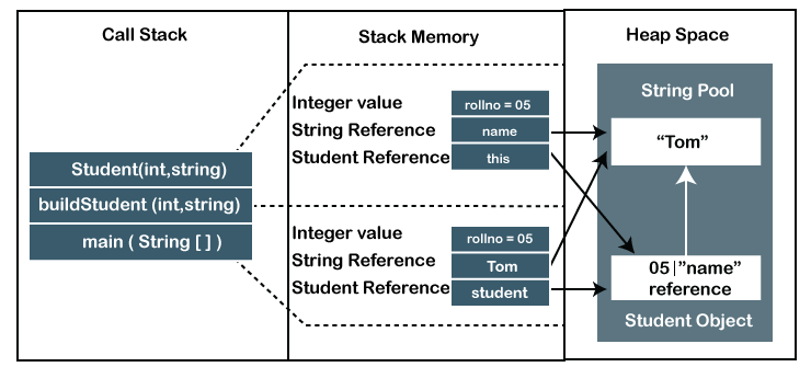 변수는 스택 영역에 생성되고 객체는 힙 영역에 생성된다. 위의 Integer value 는 직접 값을 저장하고 있지만 String, Student 클래스는 힙 영역의 주소값을 갖고있다.