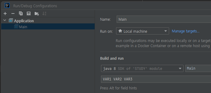 main() 메서드는 String 배열을 인자로 받아서 실행된다. IntelliJ 에서는 이 배열의 값을 아래와 같이 할당해볼 수 있다.
