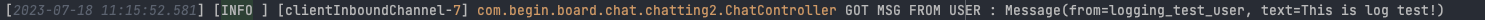 INFO 레벨에서 로그가 출력되는 것을 확인할 수 있다. 위와 같이 변수의 값이 들어갈 부분을 중괄호로 지정하면 포맷팅을 통해 로그 메시지가 구성된다.
