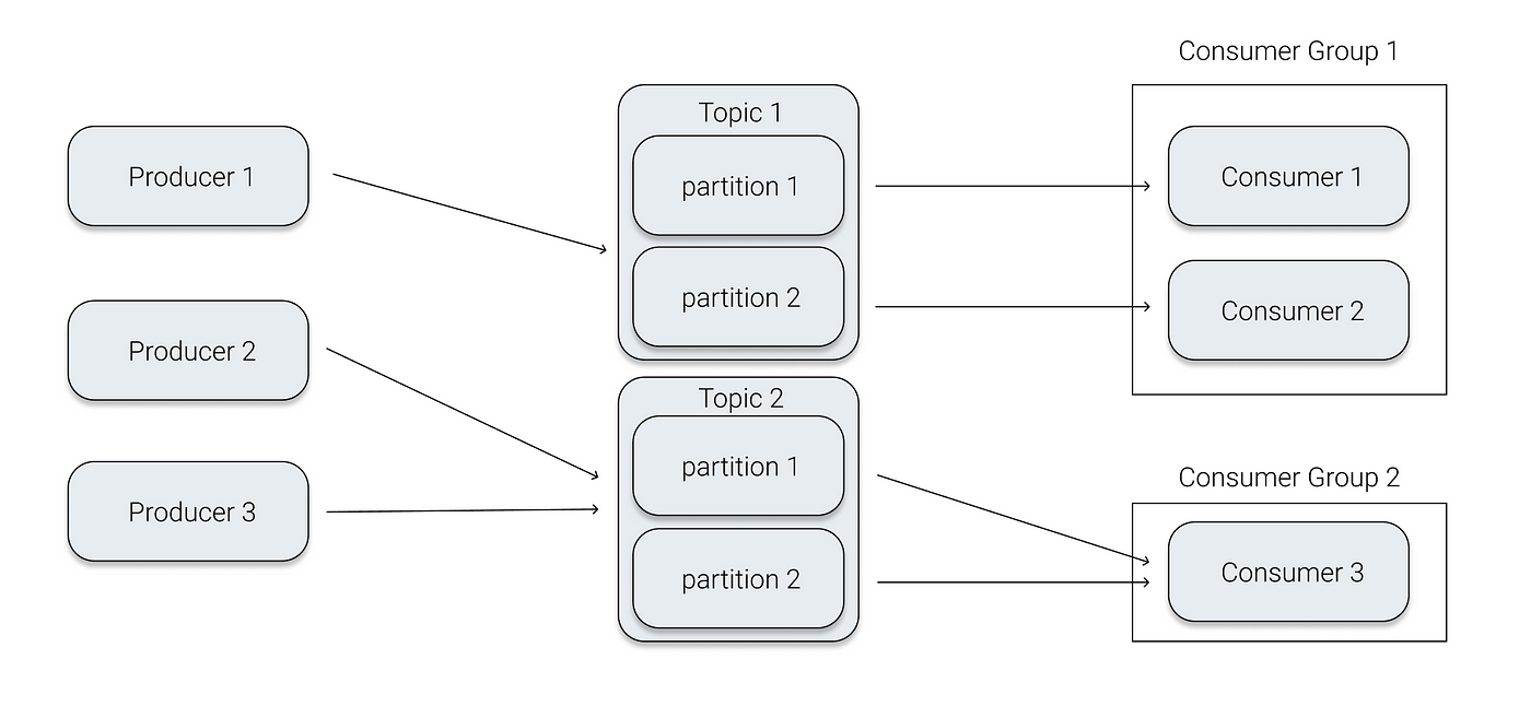 Kafka 는 Producer/Consumer 개념을 사용한다. Publisher/Subscriber 에 각각 매칭된다고 생각하면 된다. Producer 이 Topic 에 이벤트를 보내면 해당 이벤트는 Topic 의 각 Partition 에 분산되어 저장된다. Topic 을 구독하고 있는 Consumer Group 내의 Consumer 은 각각 1 개 이상의 Partition 으로부터 이벤트를 가져온다.